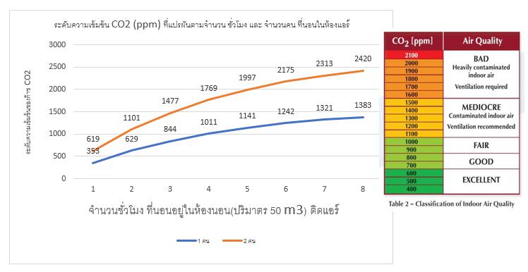 ตารางที่ 2 ระดับความเข้มข้น CO2 (ppm) ที่แปรผันตามจำนวนชั่วโมง และจำนวนคน ที่นอนในห้องแอร์